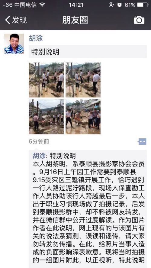 拍攝者發(fā)布“特別說明” 胡黎明是這張圖片的拍攝者,他也是保險公司的工作人員。他告訴記者,他當(dāng)時拍下了這張照片,并隨手發(fā)到了一個攝影群里,結(jié)果沒想到最后被傳成這樣。 今天下午在他的朋友圈發(fā)布了“特別說明”: 本人胡黎明,系泰順縣攝影家協(xié)會會員。9月16日上午因工作需要到泰順縣9.15受災(zāi)區(qū)三魁鎮(zhèn)開展工作,恰巧遇到一行人路過泥濘路段,現(xiàn)場人保查勘工作人員協(xié)助該行人跨越最后一步,本人出于職業(yè)習(xí)慣現(xiàn)場做了拍攝記錄,后發(fā)到泰順攝影群中,卻不料被網(wǎng)友轉(zhuǎn)發(fā),并在微信群中公開過度解讀。作為圖片作者在此說明,網(wǎng)上現(xiàn)有的與該圖片有關(guān)的說法系猜測、誤讀和謠傳,請大家勿轉(zhuǎn)發(fā)勿傳播。在此,給照片當(dāng)事人造成的負(fù)面影響深表歉意?,F(xiàn)將當(dāng)時拍攝的一組圖片附此,以正視聽,特此說明。 胡黎明說,當(dāng)時他跟同事一起去處理保險理賠的事務(wù),地點就在三魁鎮(zhèn)薛宅村,“我當(dāng)時拍這個是想體現(xiàn)災(zāi)情面前人與人之間相互救助,沒想到最后完全變了味道,這是被人過度解讀了。” (責(zé)任編輯:admin) |